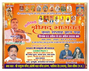 श्री भगवान परशुराम जी की प्राण प्रतिष्ठा की द्वितीय वर्षगांठ के उपलक्ष में संतोषी माता मंदिर पर श्रीमद् भागवत कथा सप्ताह ज्ञान यज्ञ का आयोजन किया गया भागवत कथा 3 तारीख से लेकर 9 तारीख तक प्रतिदिन पारायण किया गया कथा ब्यास परम पूज्य राघव किंकर महाराज द्वारा किया गया आज कथा में सुदामा चरित्र की कथा हुई जिसमें श्री कृष्णा और सुदामा के मरने कथा का वर्णन किया गया इस संगीत में भागवत कथा में परम आनंद की प्राप्ति हुई कथा में बड़ी संख्या में महिलाएं एवं पुरुष उपस्थित रहे ब्राह्मण समाज के अध्यक्ष श्री बांके बिहारी शर्मा ने बताया कि कल हवन एवं कन्या भोज के साथ भंडारा होगा जिसमें समस्त लोग आमंत्रित हैं इस आयोजन में समिति द्वारा या मेरे द्वारा कोई भूल हो गई हो तो मुझे सभी लोग क्षमा करें कथा के अंतिम दिन क्षेत्रीय विधायक श्री प्रतिभा अग्रवाल ने कथा व्यास का माल अर्पण शाल श्रीफल बैठकर सम्मान किया।